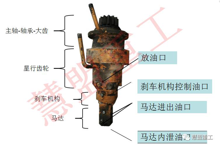 剎車機(jī)構(gòu)竄油到回轉(zhuǎn)減速機(jī)內(nèi),是很常見(jiàn)的情況 ,也是我們這次重點(diǎn)講解的對(duì)象,我們需要從回轉(zhuǎn)減速機(jī)上拆下剎車機(jī)構(gòu),并進(jìn)行分解。