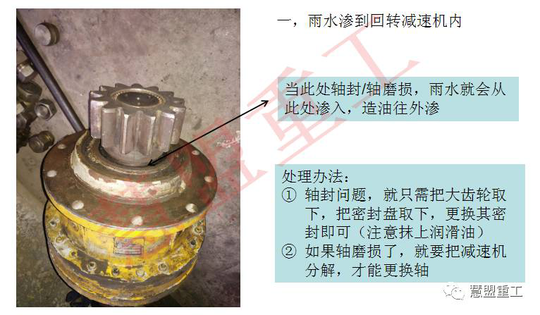 ②回轉(zhuǎn)減速機(jī)馬達(dá)軸封老化或損壞,軸磨損,馬達(dá)的液壓油竄到減速機(jī)內(nèi)。